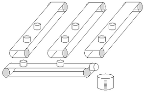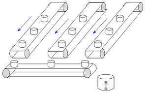 figuur 6: Nu beginnen de transportbanden te bewegen en schuiven de bekers langs de transportbanden.
